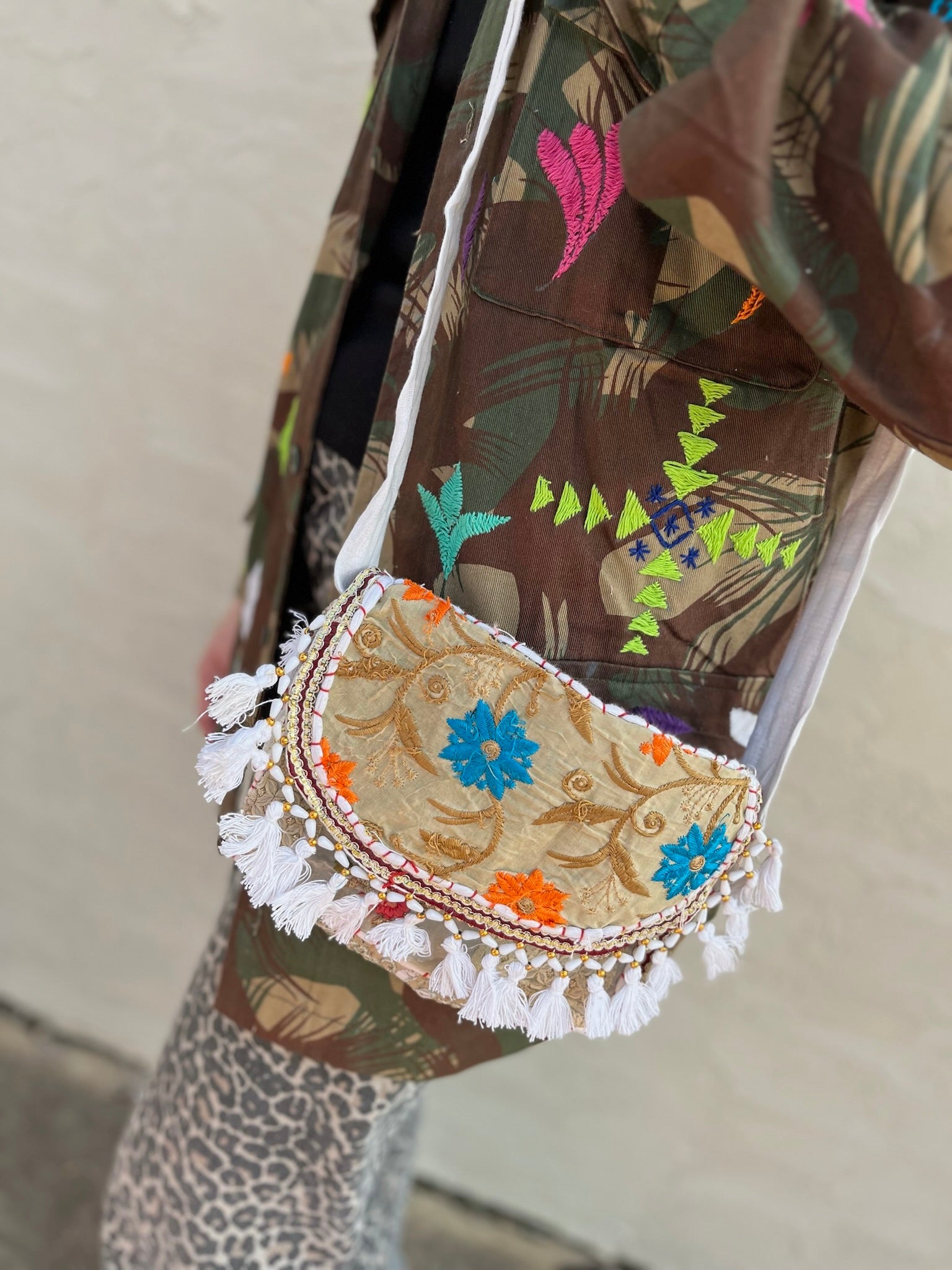 One-of-a-kind embroidered crossbody crafted from vintage-inspired textiles and finished with intricate trim and tassel details. A small statement piece with major character.