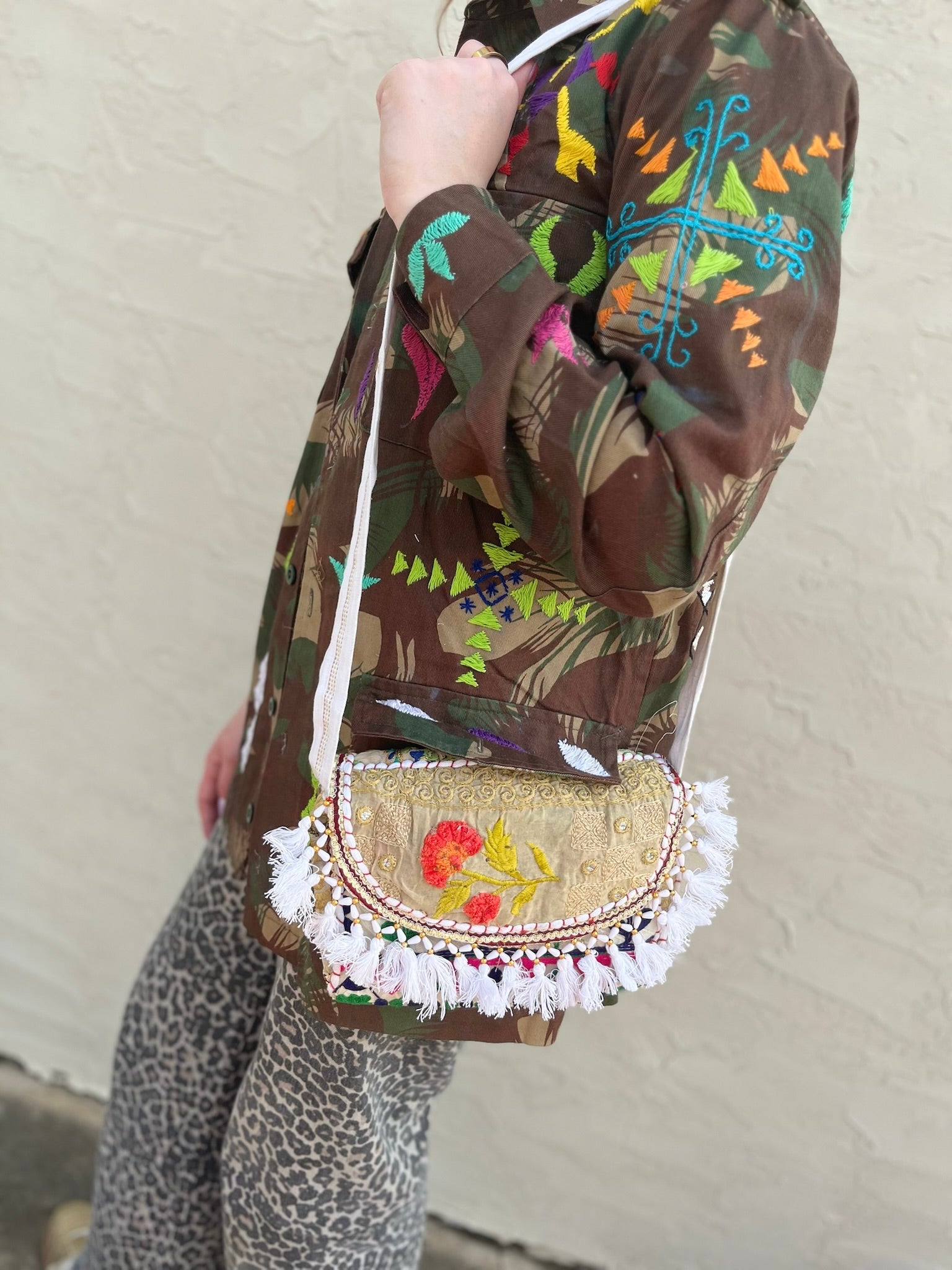 One-of-a-kind embroidered crossbody crafted from vintage-inspired textiles and finished with intricate trim and tassel details. A small statement piece with major character.